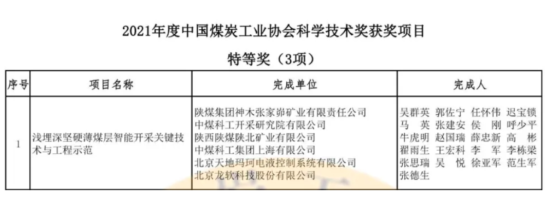 2021年12月10日,中國煤炭工業(yè)協(xié)會2021年度科學(xué)技術(shù)獎獲獎名單頒布,北京龍軟科技股份有限公司喜獲特等獎一項、一等獎一項、三等獎一項。